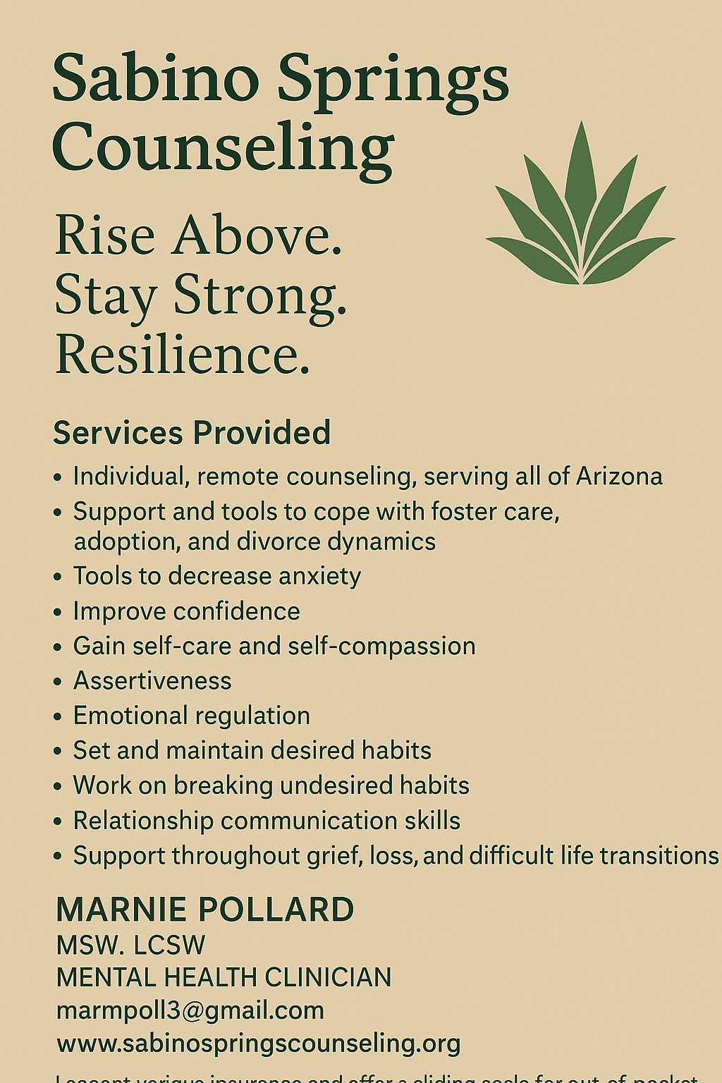 Since earning my master’s degree in social work from Arizona State University, in 2000, I've provided tailored support to individuals and families experiencing trauma, anxiety, depression, family/relationship stressors, anger management, and life transitions. Additionally, I have extensive experience supporting youth and caregivers coping with trauma of past abuse, neglect, foster care, adoption, and divorce. Tools I’ll share with you come from a variety of interventions such as Cognitive Behavioral Therapy (identifying how our beliefs and thoughts shape our emotions and behaviors), Dialectical Behavior Therapy (acceptance, gaining interpersonal skills, and regulating our emotions) and trauma-focused interventions such as Cognitive Processing Therapy. I’ve valued learning how to assimilate these therapies with mindfulness, life-balance, and self-compassion. Through continuous assessment and feedback, I’ll try to match the most helpful tool to your specific goals, current circumstances, and strengths.